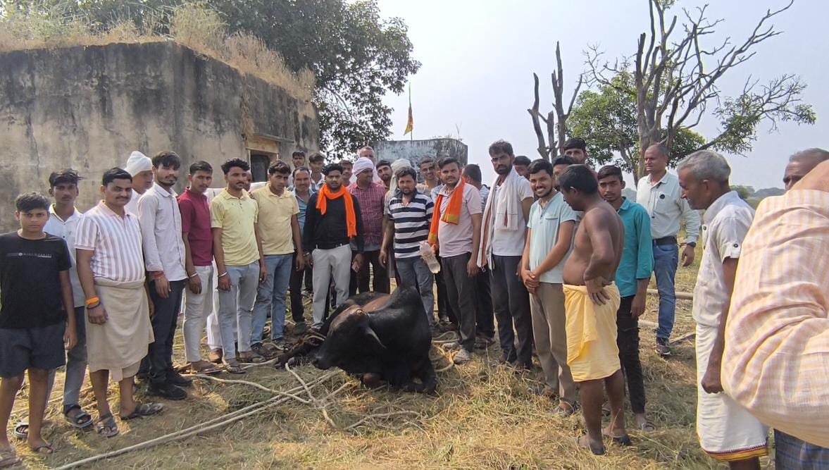 मुरैना:- थाना सरायछोला के अंतर्गत मृगपुरा पंचायत के लाला का पुरा पर खुले पड़े कुएं में गौवंश गिर गया जिसकी सूचना गौ रक्षा दल के प्रदेश महामंत्री व गौ सांसद रुद्रप्रताप सिंह राठौर को मिली तो वह अपनी टीम व रेस्क्यू का सामान लेकर मौके पर पहुंचे और देखा कि कुआं काफी गहरा व सकरा था गौवंश 80 फीट गहरे कुएं में फंसा हुआ था जिसमें गांव के रामू परमार, छोटू परमार कुएं में घुसे और गौवंश को बांधा लेकिन जब गौवंश को ऊपर खींचा तो रस्सा खुल गया फिर वही द्वारा कुएं में घुसे और गौसेवक सुदामा कुशवाह भी साथ में घुसे जिन्होंने मिलकर गौवंश को सुरक्षित बांधा और गांव वालों की मदद से व ट्रैक्टर की सहायता से गौवंश को बाहर निकाल लिया जिसका पशु चिकित्सक के द्वारा उपचार कराया।