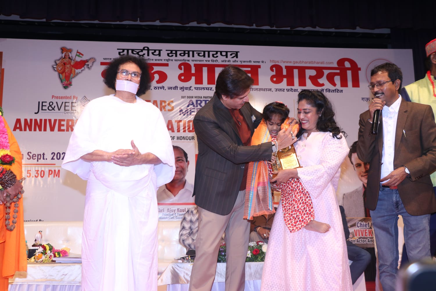 गुरुदेव आचार्य लोकेश मुनि और विवेक ओबेरॉय द्वारा “गौ भारत भारती” में पाँच बार विश्व रिकॉर्ड होल्डर के रूप में सम्मान