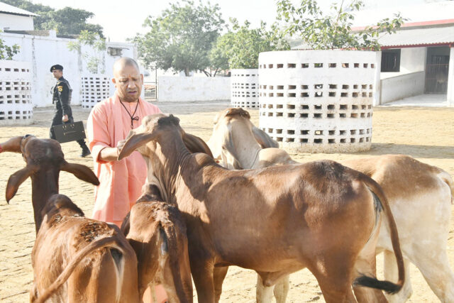 गोरक्षपीठाधीश्वर, महंत श्री @myogiadityanath जी महाराज व मुख्यमंत्री ने आज प्रातः श्री गोरखनाथ मंदिर परिसर में भ्रमण किया एवं परिसर स्थित गोशाला में गोसेवा की। महाराज जी ने गोवंशों को गुड़ भी खिलाया।