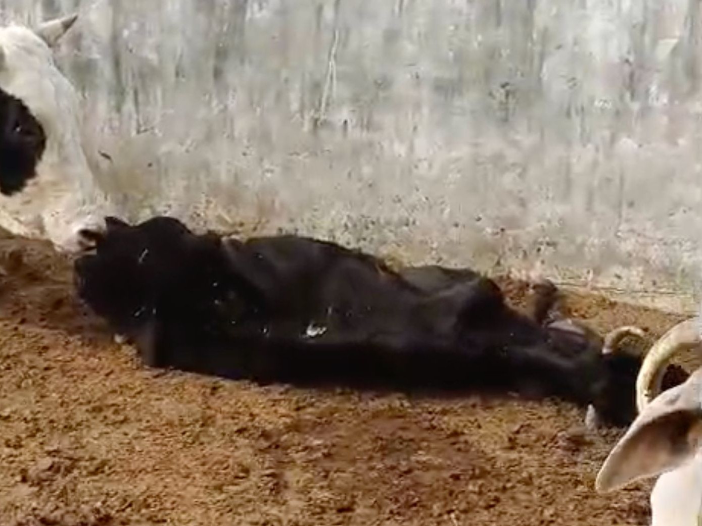 वीडियो में एक काली गाय दीवार के सहारे जमीन पर पड़ी दिखी, जिसकी हालत नाजुक बताई गई।